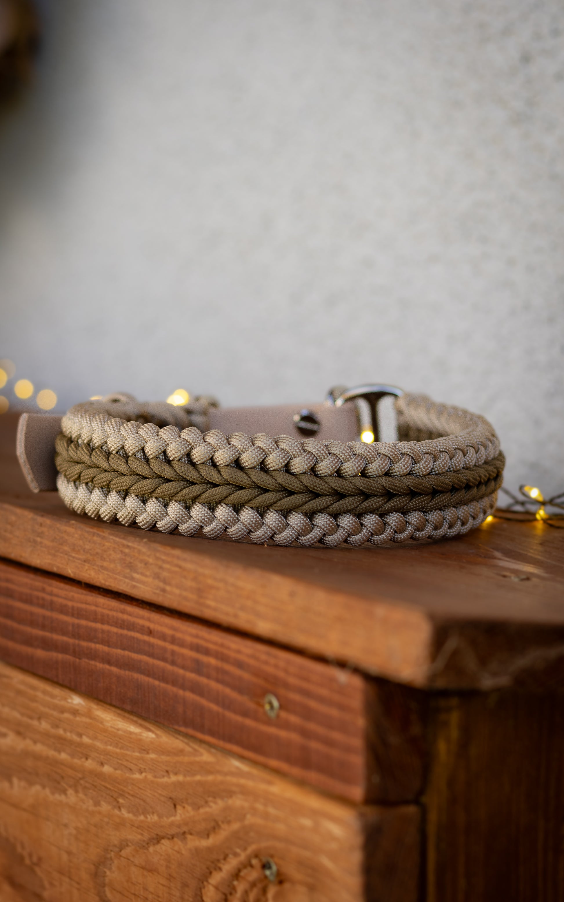 Tento paracordový obojek je elegance sama! Kombinace béžové a světlé khaki zaručuje, že se hodí k jakékoliv barvě srsti :)